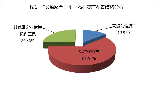 截至2016年6月30日,“长盈聚金”季季添利理财计划共配置资产396,191.07万元,其中:高流动性资产55,199.62万元,占比13.93%;标准化资产243,713.46万元,占比61.51%;其他固定收益投资工具97,277.99万元,占比24.56%。 如图1所示:
