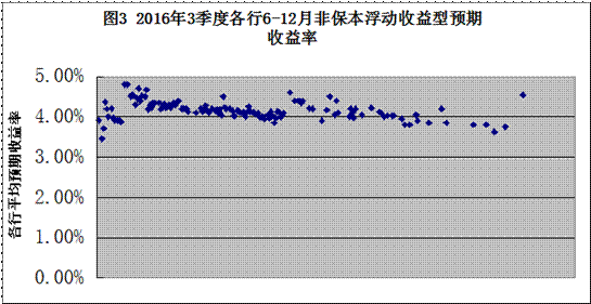 2016年3季度,非保本浮动收益型理财产品发行量为17364款,环比增加2125款,市场占比为72.88%。6-12个月期限类型产品的平均预期收益率为4.11%,环比上季度下滑27个BP。各家银行6-12个月期限类型非保本浮动收益型理财产品平均预期收益率如图3所示。“长盈理财”白金专属(A款)理财计划2016年3季度平均预期收益率为4.40%,高出全国预期收益率29个BP,整体收益率在同类产品中保持排名靠前的水平。