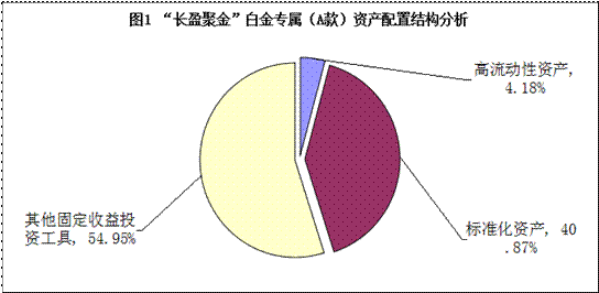 截至2016年9月30日,“长盈理财”白金专属(A款)共配置资产496,326.37万元,其中:高流动性资产20,734.25万元,占比4.18%;标准化资产202,861.38万元,占比40.87%;其他固定收益投资工具272,730.74万元,占比54.95%,如图1所示。